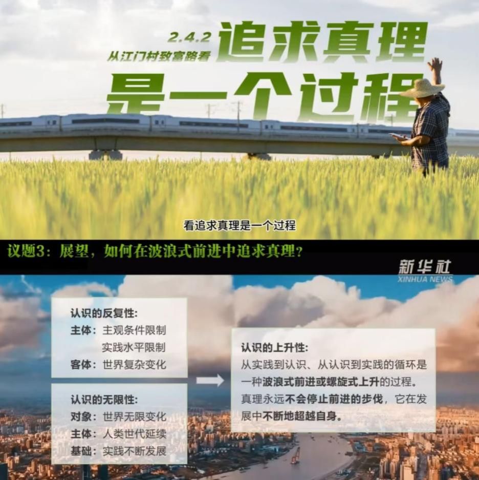 通过讲授法、活动法、议题式教学法等教学方法,使用ppt动画展示江门村的故事,激发同学的兴趣;同时加入动漫视频,增添课堂活力;用动画的方式讲解方法论,让同学们更加直观的学习到本节课的知识点,掌握人类追求真理的认识规律。通过讲解党带领人民追求真理的历程,适当加入配乐,有效地渲染学生情绪,引导学生形成对党和国家的政治认同,提升作为新时代青年的社会责任感。