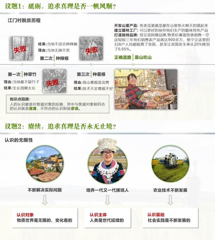 微课选自人教版必修4的第四课探索认识的奥秘的第二节“在实践中追求和发展真理”,以2022年度感动中国人物杨宁的故事和江门村脱贫致富历程导入,层层推进,引出追求真理是一个过程。