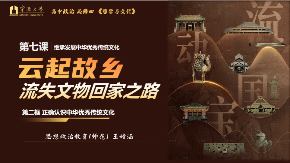 微课题源经典歌曲《故乡的云》,结合最新的文化政策方针,选取近期热点文物话题——火爆出圈的短视频作品《逃出大英博物馆》为导课引入,以“故土难归,为何流失?如何归家?”为主线,并凝练分为三个分议题“ 追本溯源:回家前的追忆探寻 ”“归途漫漫:回家路途艰难险阻”“ 重获新生:回家后崭新再出发”,层层递进探索海外流失文物回家之路,帮助学生了解把握中华优秀传统文化的内容、特点及地位,理解对待中华传统文化的正确态度,明确中华优秀传统文化的当代价值,增强对中华优秀传统文化的认同感,培养正确的文艺观。