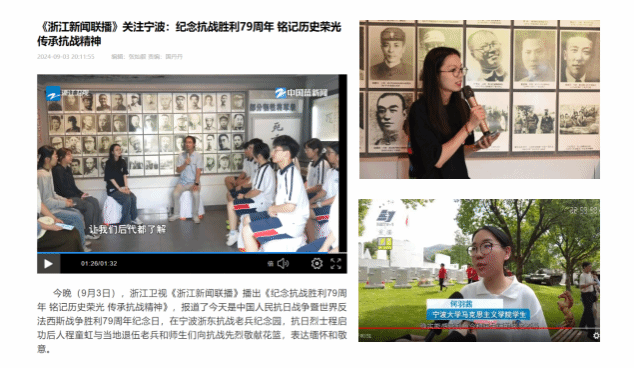 的辅导员任彬老师,向五乡中学的学生们分享了如何运用暑期实践开展关于爱国主义项目的实例和成就,着重介绍了学院“红扬浙里”暑期社会实践项目。她表示今年是该团队“寻访浙江老革命者”的第六个年头,目前该团队在郑善庆老师的指导下已完成制作《一段隐匿的历史——我的浙东革命》纪录片、出版《抗战回眸——浙东新四军口述史》书册,实现了红色资源、红色课程、红色教学团队环环相扣。这节别样的思政课也被浙江新闻联播、浙江卫视等省级媒体报道。