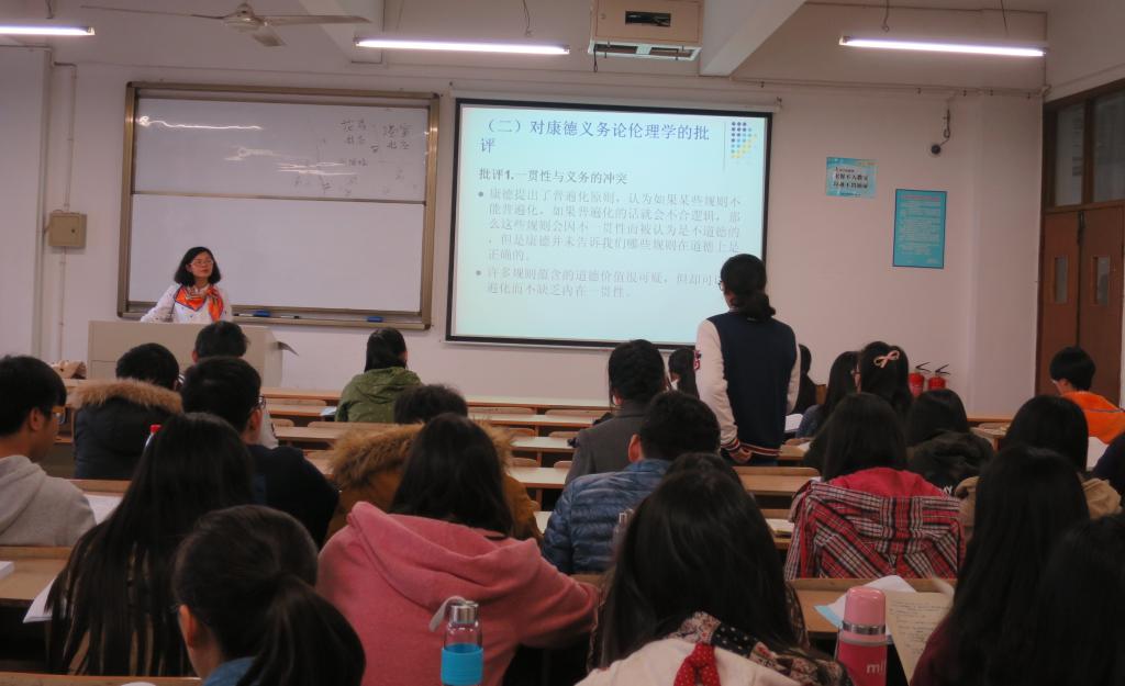 11月12日下午,a片 本学期第一期院级公开教学观摩活动在6号楼314教室开展,本次公开课由曲蓉副教授主讲,主讲课程为《伦理学》,从“对康德义务论伦理学的批评”、“罗斯的显见义务论”、“对非结果论的批评”三个方面进行了详细的讲解和阐述。曲蓉老师的课程教学内容详实且有理论深度,案例丰富便于理解,通过知识点的回顾,增加与学生之间的互动。
