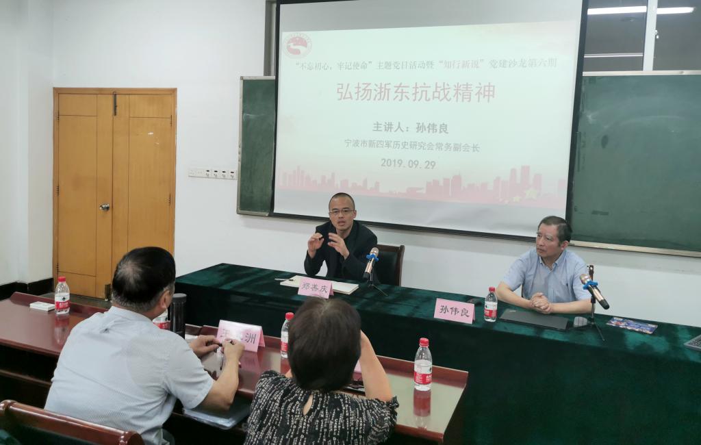 在包玉书科技楼11号楼102室举办了“不忘初心,牢记使命”主题党日活动。宁波市新四军历史研究会常务副会长孙伟良应邀作《弘扬浙东抗战精神》主题讲座。活动由学院郑善庆副教授主持。