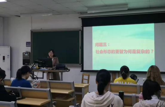 苗小露博士主讲的课程为《马克思主义基本原理》的“人类社会及其发展规律”一节。苗博士以“社会形态更替为何是复杂的”这一问题作为本节课程的切入口,从社会形态更替的统一性和多样性、必然性和选择性、前进性和曲折性这三个方面依次展开讲解。随后又从“社会历史发展的决定性力量是什么”这一问题展开讲解了社会基本矛盾这一内容,并结合了我国现下的国情加以阐述。课堂上,苗博士通过提问、师生互动讨论的教学方式,运用大量的数据和案例分析,对社会形态的概念,社会形态的复杂性以社会基本矛盾进行了深入的剖析。苗博士语言生动,讲解思路清晰,教学内容理论性强,课件新颖,课堂教学氛围浓厚。