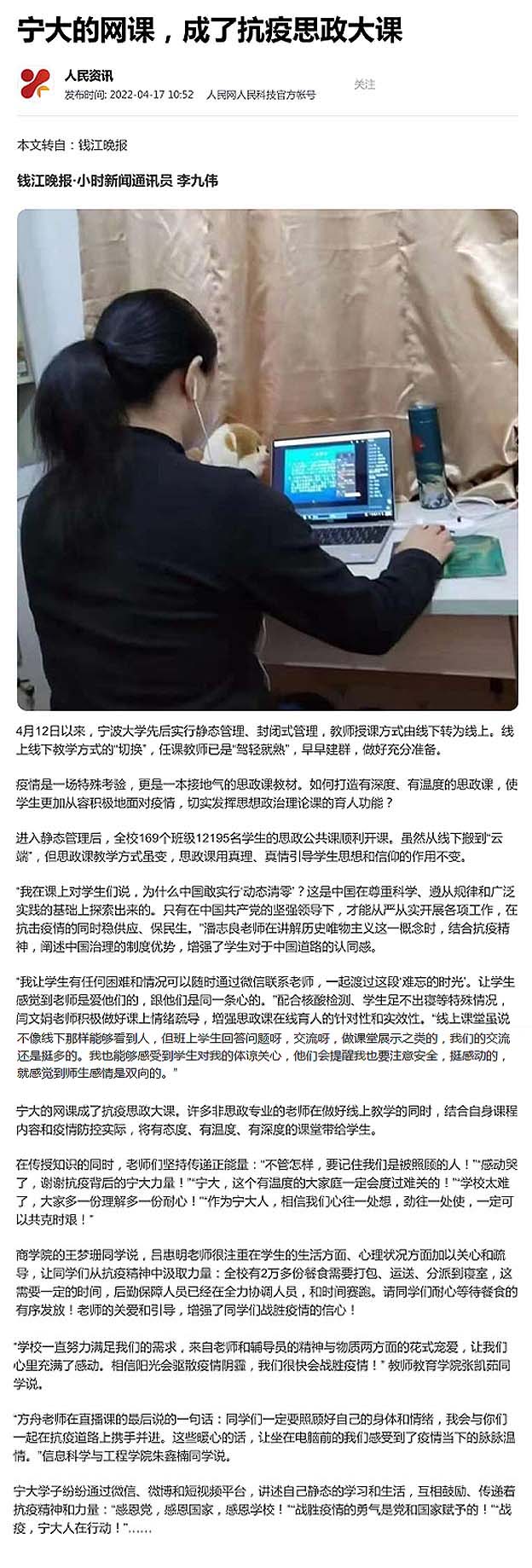 如何打造有深度、有温度的思政课,使学生能够更加从容积极地面对疫情?a片 如何切实发挥思想政治理论课的育人功能?4月17日的钱江晚报对a片 抗疫思政云课堂作了报道……