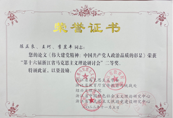 陈正良教授、冯程老师出席会议。由陈正良教授,研究生王珂、李昱丰撰写的论文——《伟大建党精神:中国共产党人政治品质的彰显》荣获“第十六届浙江省马克思主义理论研讨会”二等奖。在会上,陈正良教授作了题为《伟大建党精神——中国共产党人政治品质的彰显》的专题报告。