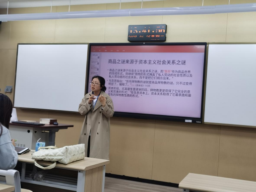 丁燃从资本论的隐喻“桌子跳起舞来”引出“资本主义的出场方式”,从“货币-资本-拜物教”三个方面进行了详细讲解和探讨“资本主义的价值规律”。课堂上,丁燃老师侃侃而谈,精神饱满,逻辑清晰,将抽象的理论通俗形象地展现给学生,案例生动,激发了学生学习兴趣,课堂气氛活跃,受到了听课教师的一致好评。