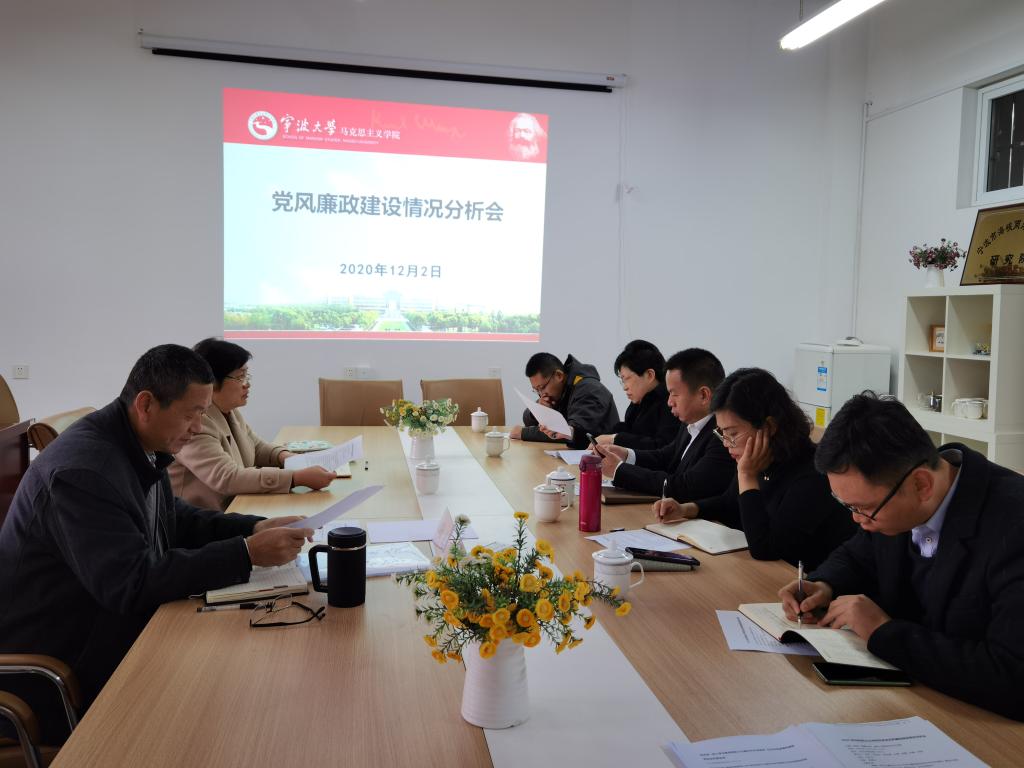 委员会关于在下属单位(部门)实行党风廉政建设情况分析会制度的意见》,分析研判了学院党风廉政建设形势。会议重点分析了“清廉马院”建设工作落实情况,领导干部落实“一岗双责”、民主集中制、作风建设情况以及单位(部门)涉及人、财、物管理使用等关键环节的反腐倡廉情况等。