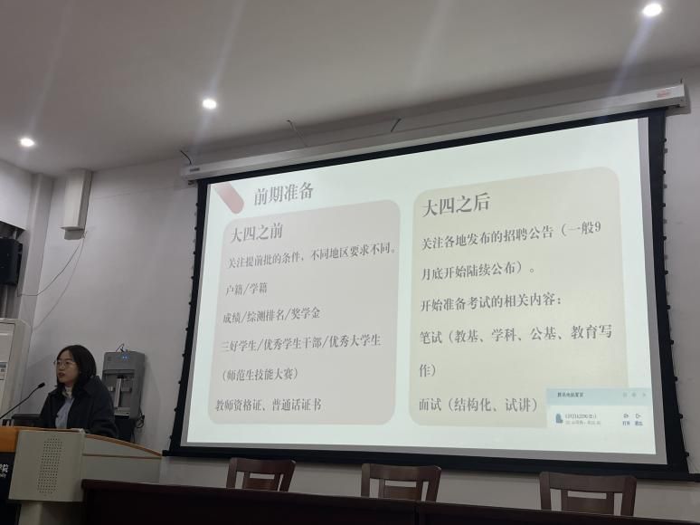会议第二部分由林佳静、王永恒、余思源同志作考编经验分享。林佳静同志以大四为分界点,谈到了大四前要积极关注提前批条件,之后则是要根据各地发布的招聘公告,准备考试的相关内容。王永恒同志从自身角度出发,分享了自己在考编过程中的切身体会和心路历程,以及对不同考试的应对方法、考试中需要注意的一些细节等,鼓励同学们自信应对编制考试,勇于做出抉择。余思源同志则提到初中社会与高中政治备考的不同之处,并提醒同学们要注重心态调节、善于总结。