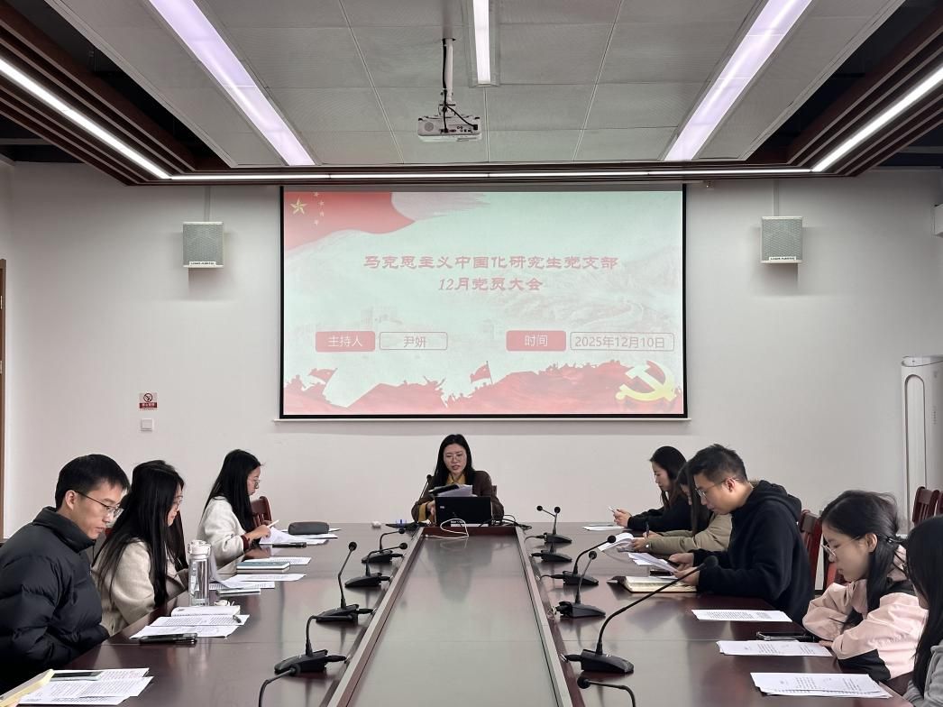 为深植理论根基、凝聚思想共识,进一步提升支部组织力与凝聚力,2025年12月10日,马克思主义中国化研究生党支部在7号楼513会议室召开12月支部大会。支部书记尹妍主持会议,全体党员参加。