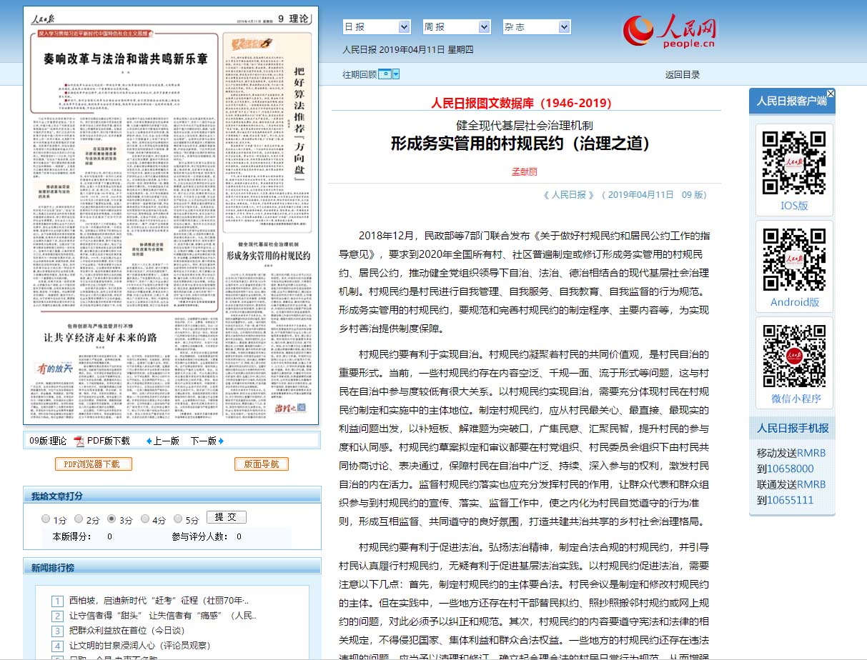 孟献丽教授的文章《健全现代基层社会治理机制,形成务实管用的村规民约》在《人民日报》第九版理论版刊载,这是a片