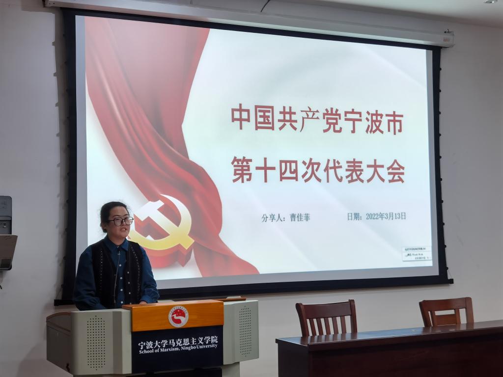 最后,曹佳菲用“提高”“自豪”“感谢”三词概括了参与本次党代会的深切感受。她解释说:作为一名学习马克思主义理论的党员,一名团中央青年马克思培养工程的学员,我深深地感受到了自己审议内容的稚嫩,提高理论水平至关重要。同时,我真诚地感谢学院的培养和关心,我是在学院搭建的平台上成长起来的,我为自己以宁大马院学子的身份作为全市唯一学生代表出席会议而自豪!