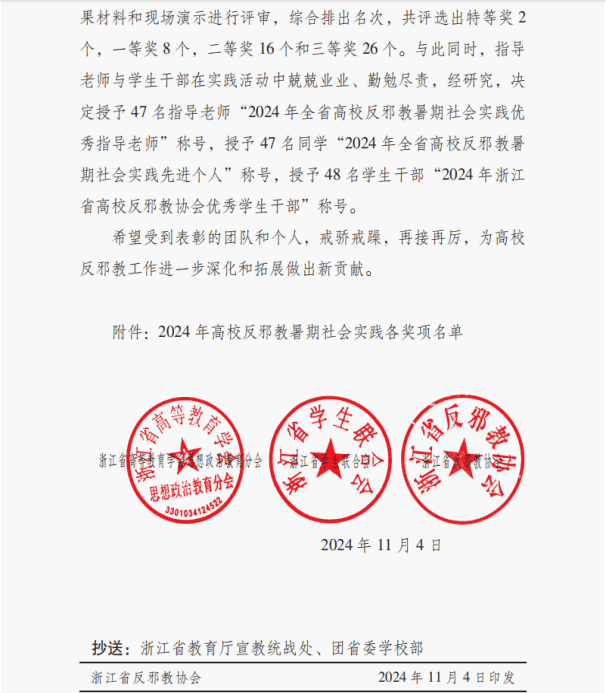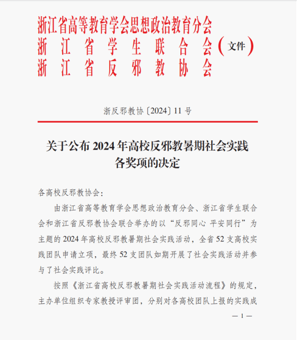 11月15日,2024年浙江省高校反邪教暑期社会实践评比结果于线上发布。我校中特反邪教暑期社会实践团队,由刘倩倩同学担任答辩选手,在2024年“反邪同心,平安同行”高校反邪教暑期社会实践活动中荣获浙江省一等奖,杨曼老师被评为“优秀指导老师”,陈雨露同学荣获“先进个人”称号,刘倩倩同学荣获“优秀学生干部”称号。