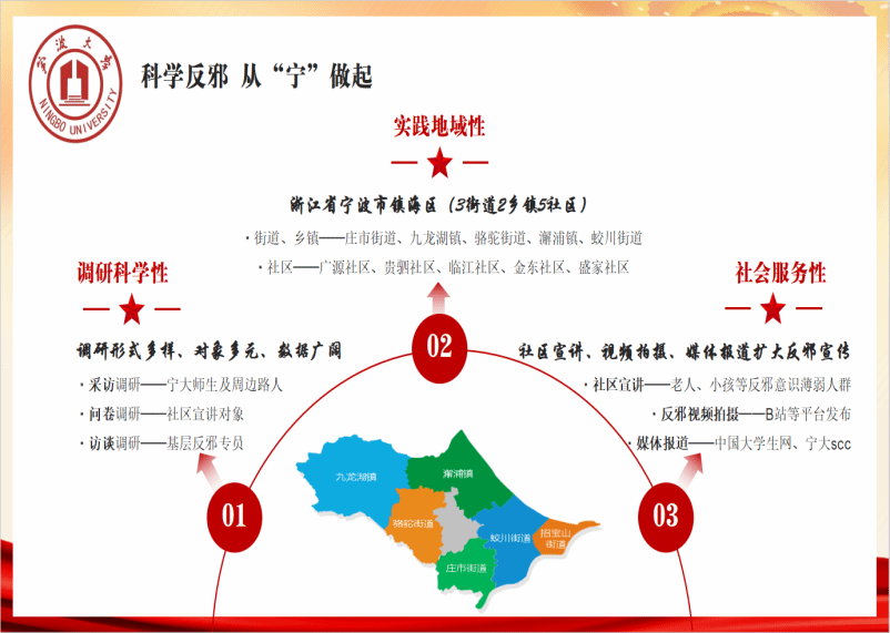 实践团队开展的基层访谈调研活动覆盖镇海区2乡镇3街道——庄市街道、骆驼街道、蛟川街道、九龙湖镇与澥浦镇,社区宣讲调研活动覆盖镇海区5社区——广源社区、贵驷社区、临江社区、金东社区与盛家社区,问卷采访调研活动涉及a片
