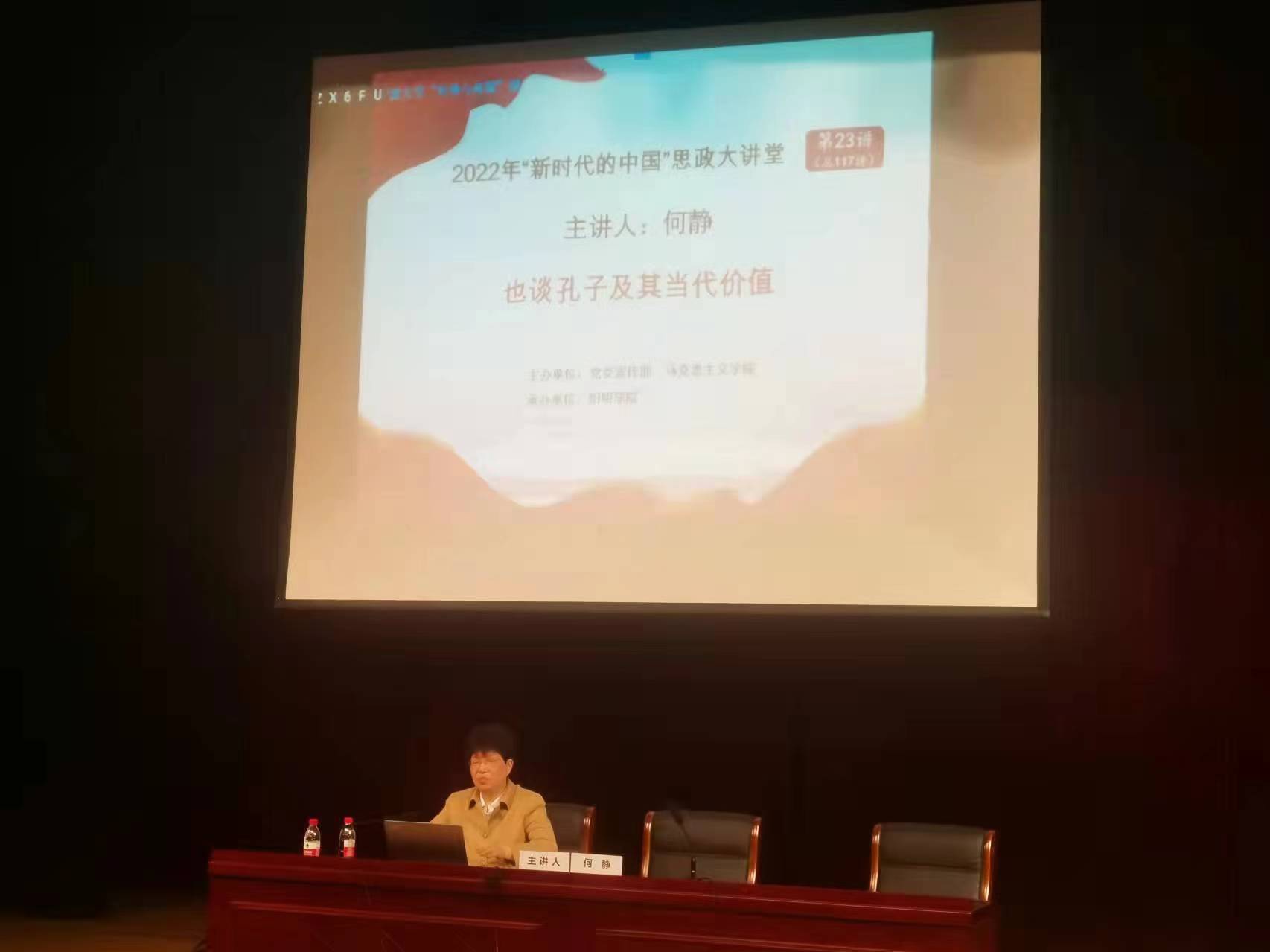 6月1日晚,a片 何静教授在a片 北区忻元甫报告厅为阳明学院学生作题为《也谈孔子及其当代价值》的“形势与政策”课。