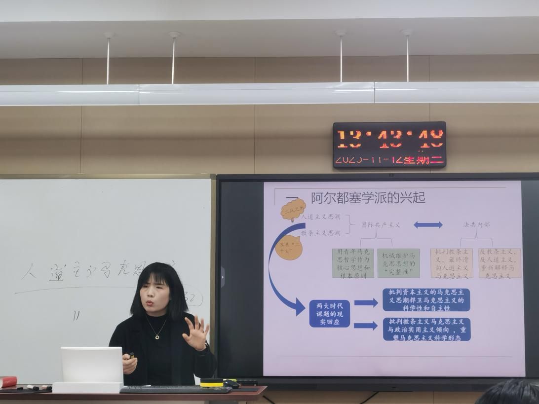 课堂上,李博士通过呈现阿尔都塞后期的自我反思与理论转向,启发学生深入思考其思想定位及当代意义。整堂课逻辑严密、层层推进,展现出教师扎实的理论功底与清晰的教学思路,有效激发了学生的理论兴趣与思辨能力。