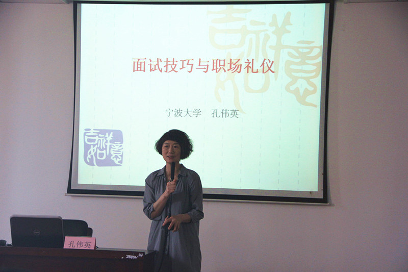 孔伟英教授从“面试礼仪”、“面试技巧”、“职场礼仪”这三个方面,就职场中面试这个重要环节在讲座中做了细致入微的讲解。孔老师首先通过案例分析说明了面试礼仪的重要性。随后又分别从个人特质、求职动机、职业观、生活观等多个方面向同学们讲解了如果准备自我介绍和面试问题。在讲到面试和职场礼仪时,孔老师请现场同学一起生动的演示了基本礼仪和动作。
