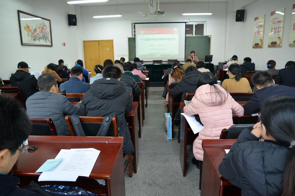 党总支书记刘友女以《中国制度为什么优?》为题,作全会精神专题报告。全院教职工参加了此次专题报告会。