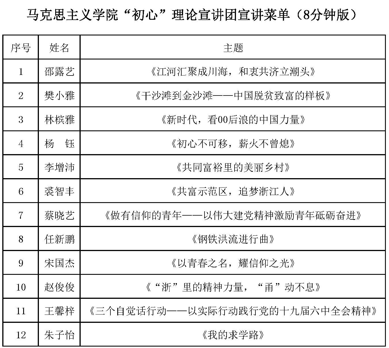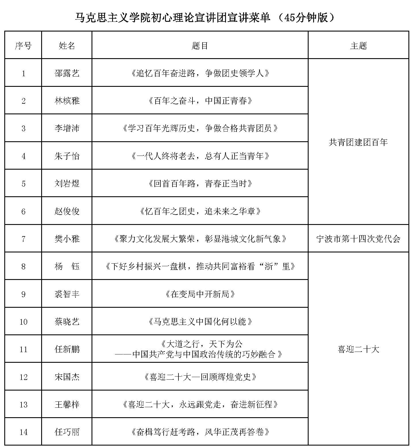 “初心”理论宣讲团发挥“本研一体”的马克思主义理论专业群优势,矢志让党的理论接近群众、打动群众,以青年之力传递青年声音,特推出相关主题宣讲菜单,献礼峥嵘岁月,提供宣讲服务。此次宣讲课程分8分钟版和45分钟版可选。具体专题如下: